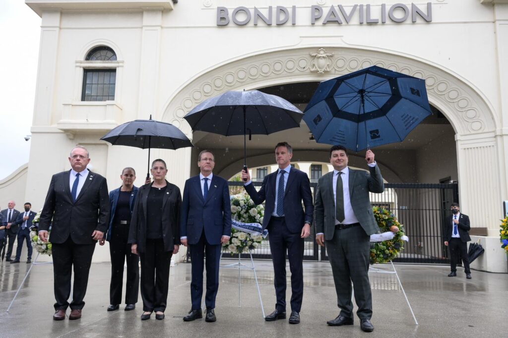 נשיא המדינה יצחק הרצוג ורעייתו מיכל, הגיעו היום, יום שני, כ״ב בשבט, 9 בפברואר, לביקור באתר פיגוע הטרור בחוף בונדי, שם נפגשו עם משפחות הקורבנות וניצולי הפיגוע, וערכו טקס זיכרון והתייחדות.